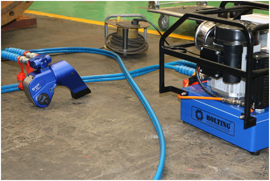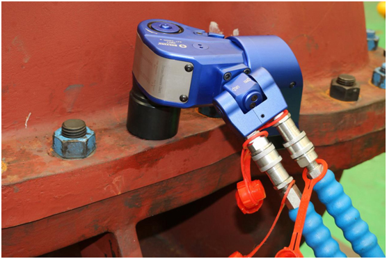2、所有高精度設(shè)備,在螺栓終緊過程中,都應(yīng)該是對(duì)角或者四角施加扭矩,避免受力不均勻造成的法蘭變形或者密封受損,避免泄露,如采用電動(dòng)扭矩扳手或者氣動(dòng)扭矩扳手,需要兩個(gè)操作工程師用兩把電動(dòng)扭矩扳手對(duì)螺栓進(jìn)行擰緊工作,時(shí)機(jī)配合等都需要相當(dāng)默契,那么四同步的情況下呢?成本相對(duì)于液壓扳手來說更高,采用液壓扳手則避免了這個(gè)問題,配置的電動(dòng)液壓泵為四同步,同一臺(tái)動(dòng)力源,不可能一臺(tái)扳手是50Mpa,另一臺(tái)48Mpa,后期有需要增加到四同步,僅需再配兩把液壓扳手和套筒即可,無需再購(gòu)買液壓泵站。