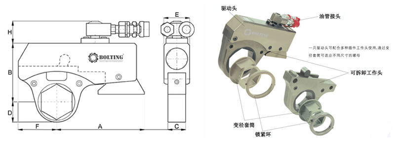 石油防噴器采油樹(shù)專(zhuān)用缺口式超薄中空液壓扭矩/扭力/力矩扳手,緊固或拆卸過(guò)程中,無(wú)需反復(fù)取下,一次安裝即可。
